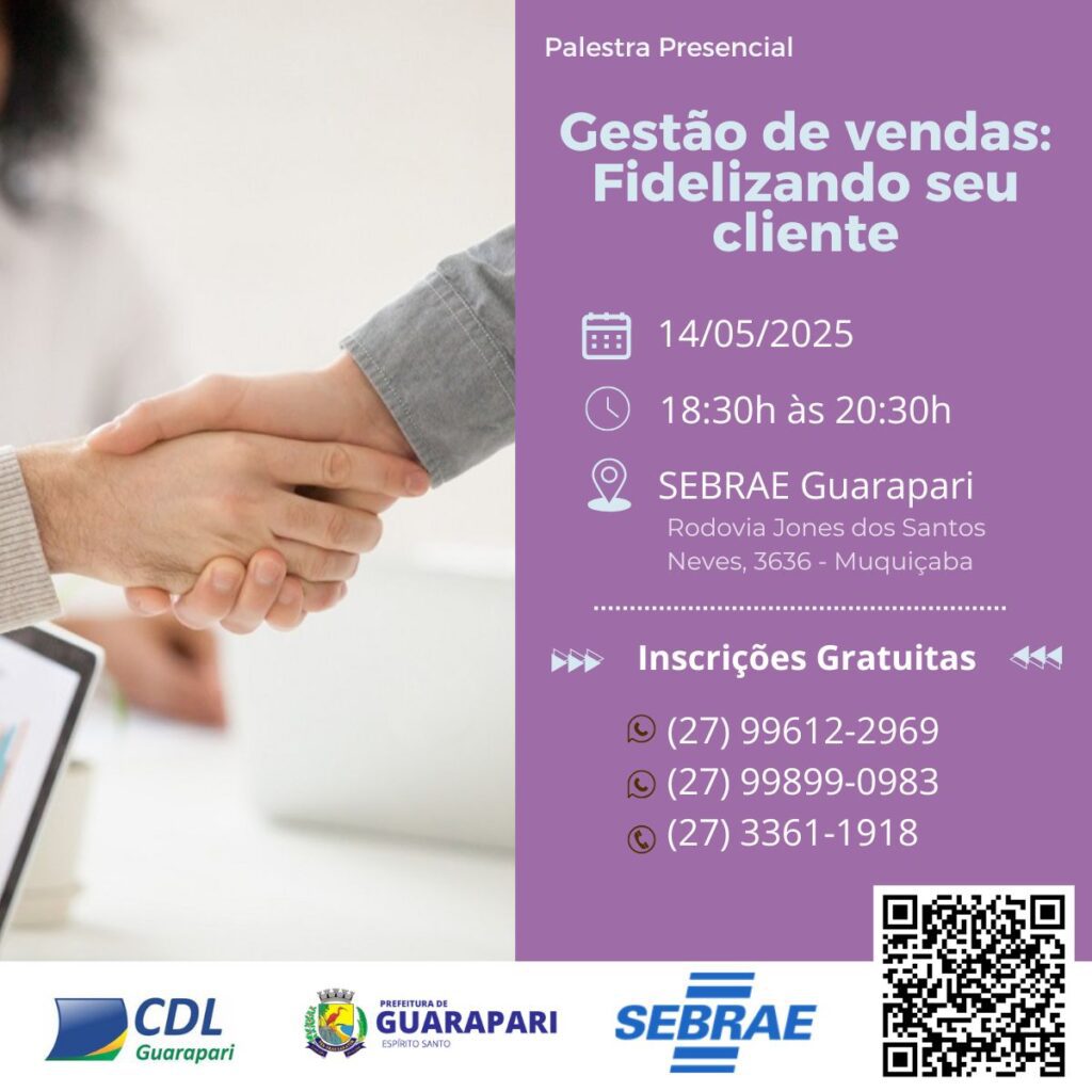 Deseja aprimorar suas vendas e fortalecer o vínculo com seus clientes? No dia 14 de maio, teremos a palestra ”Gestão de vendas: Fidelizando seu cliente”, onde você poderá desenvolver estratégias de vendas, praticidade e eficiência na fidelização de clientes.
